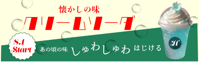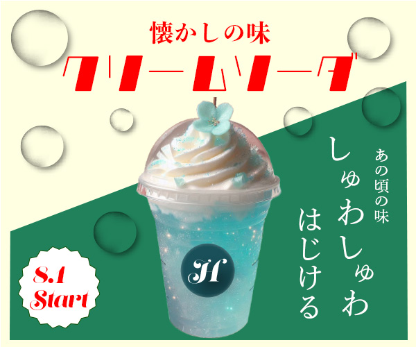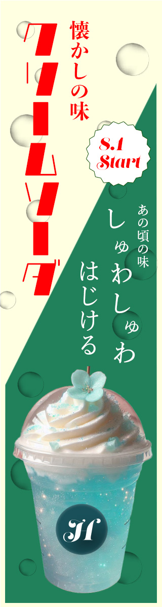 | デザイン | 背景色はクリーム色と緑色を配色し、クリームソーダを連想させた。タイトルをレトロなフォントにすることにより、どこか懐かしい雰囲気を漂わせ全世代を意識したデザインに。周りのバブルは透明に透すことで、よりソーダの弾ける様子とクリアな印象をつけた。 |